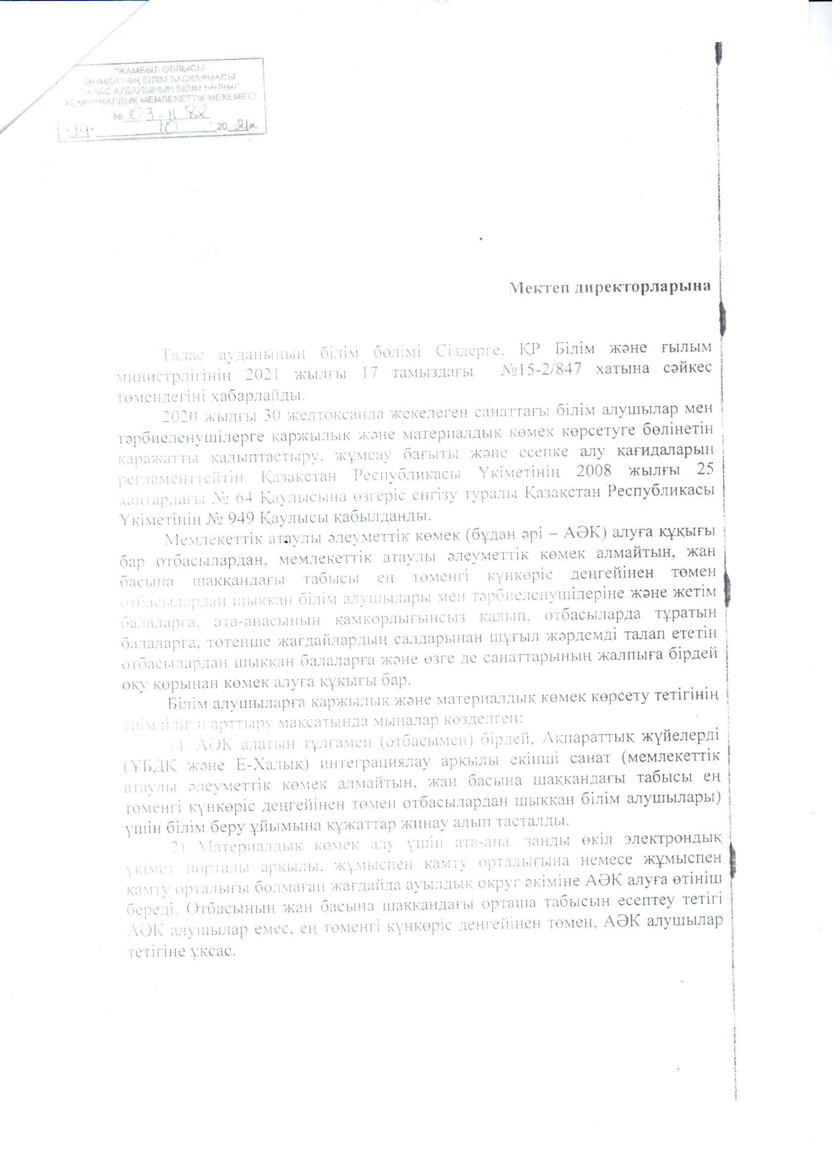 15 октябрь 2021 0 1 2 3 4 5 Қазақстан Республикасының Білім және ғылым министрлігінің 2021жылғы 17 тамыздағы №15-2/847 хат