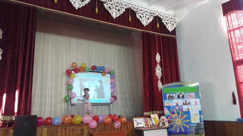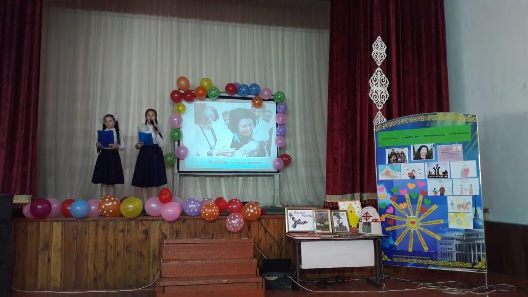 Ендеше бүгінгі біздің концертіміз Сара Назарбаева Алпысқызына арналмақ.»Даналық шыңы- махаббат десек» балаға деген ұлы сезім Сара Алпысқызының өмірлік ұстанымы. Ендігі кезекте Сара Алпысқызы Назарбаеваның өмір жолы мен оның жетістіктері жайында 7 «а» сынып оқушысы Жүрсінәлі Ақниет мен 7 «а» сынып оқушысы Байбәкір Нұрайды тыңдайық.